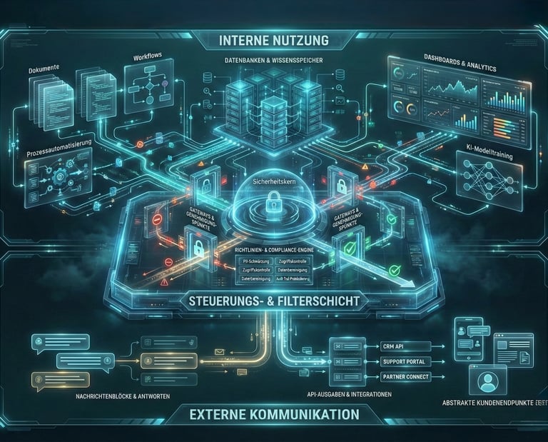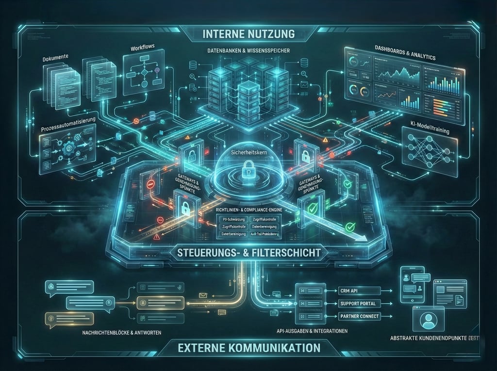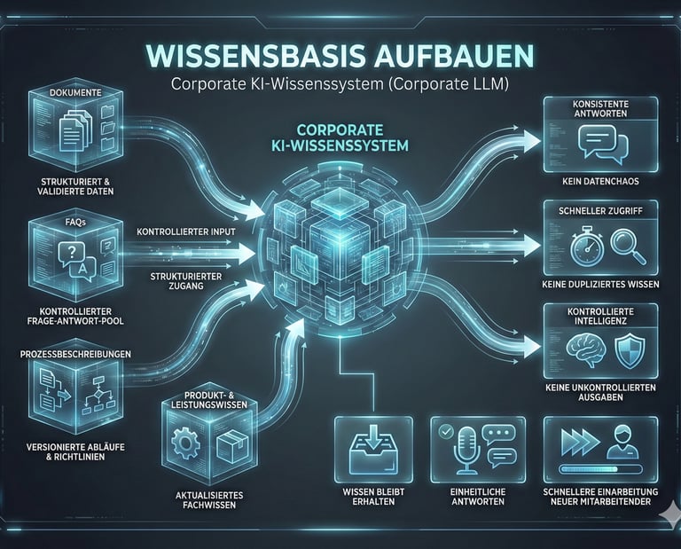 Ein Corporate LLM ist eine interne KI Wissensbasis, die ausschließlich mit freigegebenem Unternehmenswissen arbeitet und kontrolliert genutzt wird.