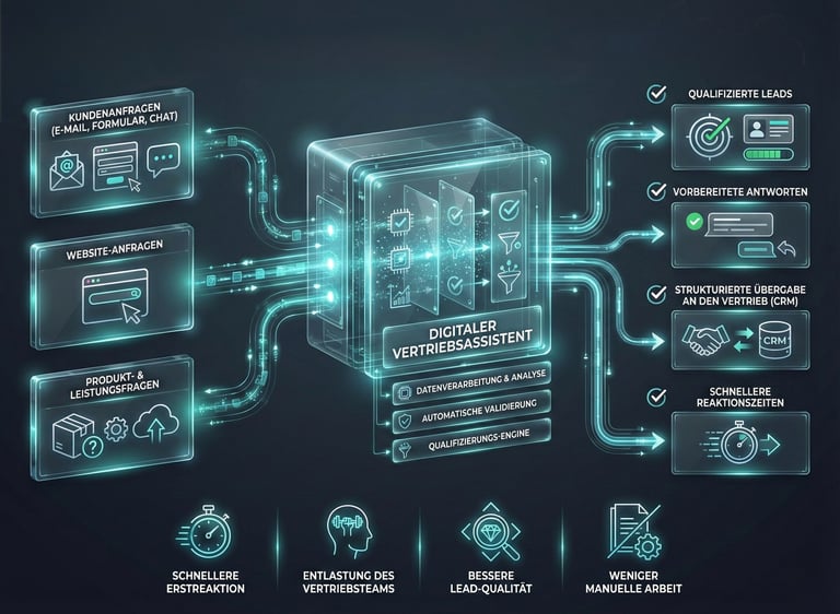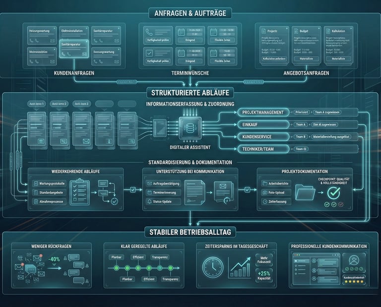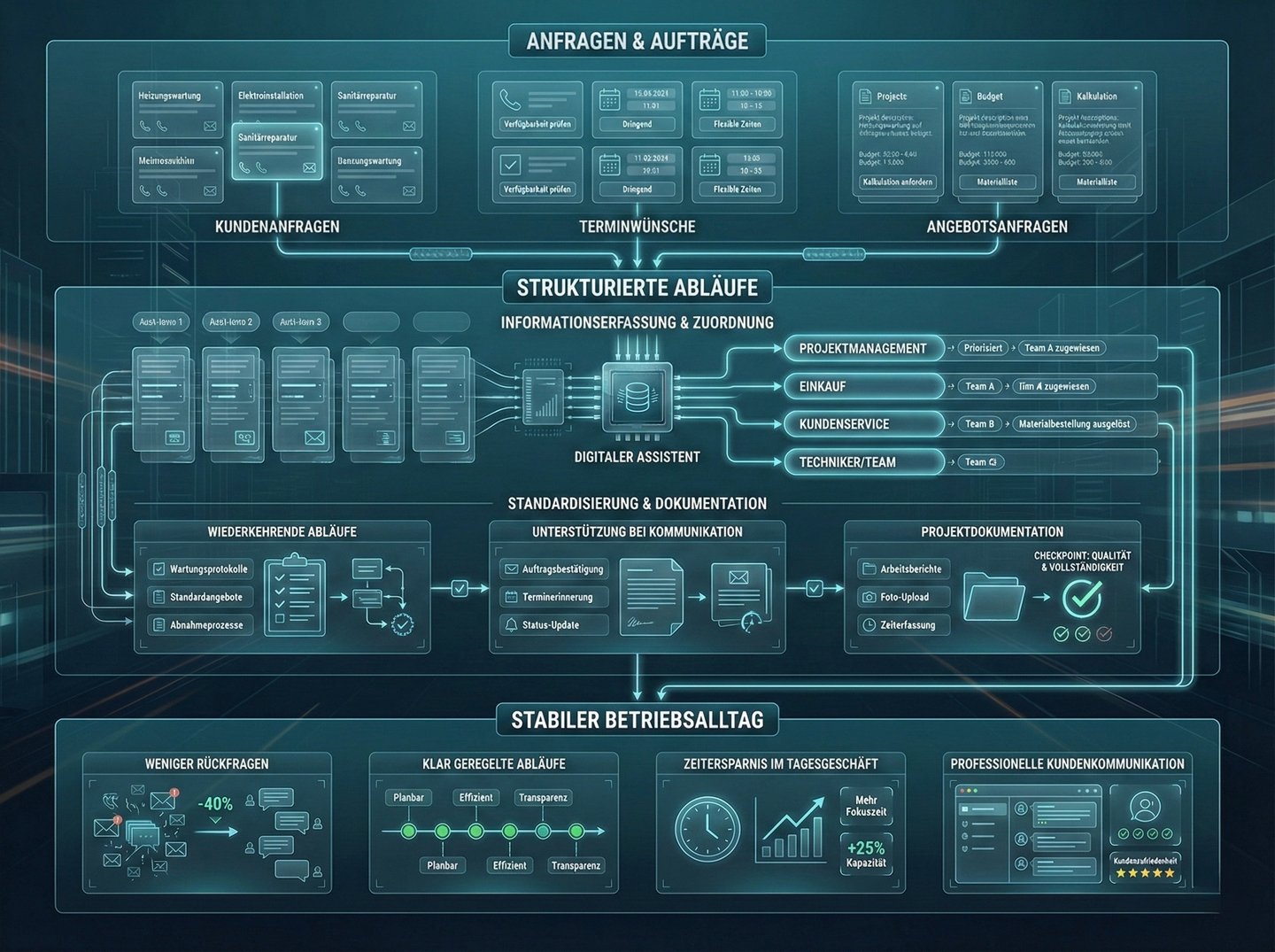 Digitale Assistenten helfen dabei, Anfragen strukturiert zu erfassen, Abläufe zu ordnen und wiederkehrende Aufgaben zuverlässig zu übernehmen, sodass weniger Zeit im Tagesgeschäft verloren geht und Kunden schneller, klarer und professioneller betreut werden.