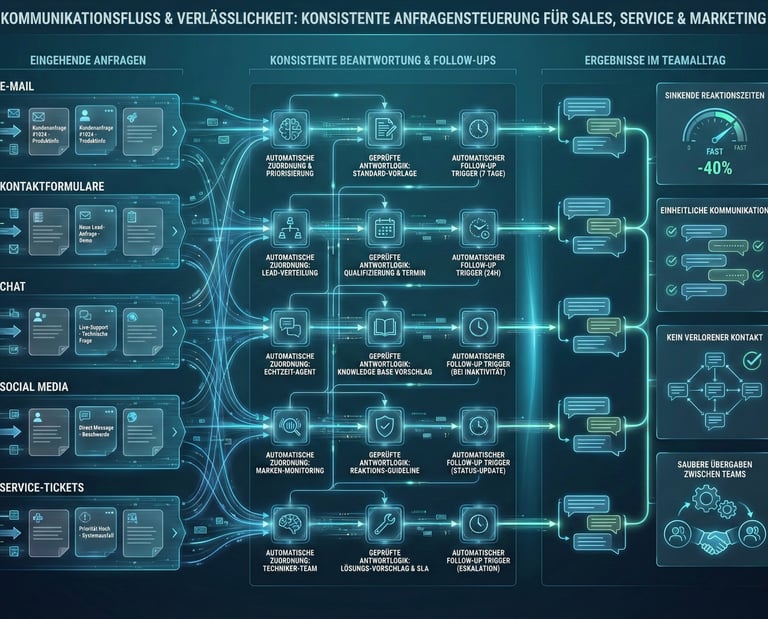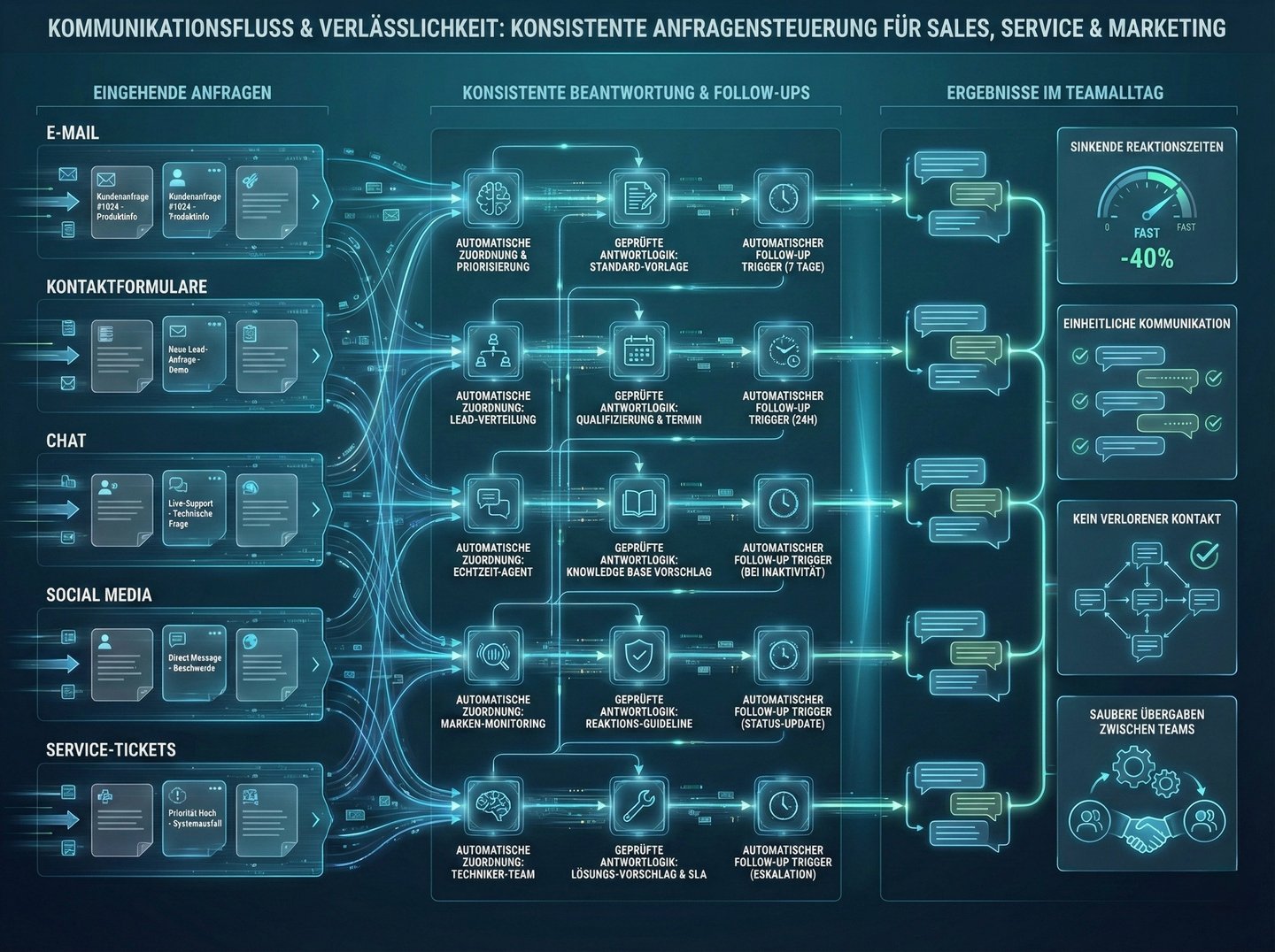 Der Assistent sorgt dafür, dass Anfragen sauber eingehen, konsistent beantwortet werden und Follow ups automatisch erfolgen, wodurch Reaktionszeiten sinken, Kommunikation einheitlich bleibt und kein Kontakt mehr verloren geht.