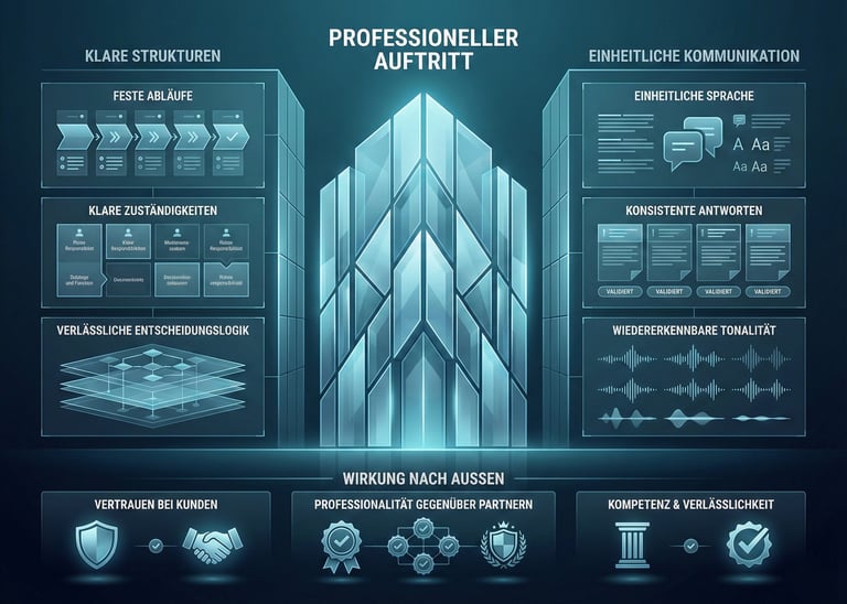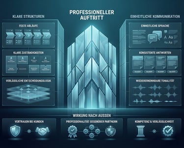 Klare Antworten, feste Abläufe und eine einheitliche Sprache schaffen Vertrauen bei Kunden und Partnern und sorgen dafür, dass das Unternehmen strukturiert, zuverlässig und kompetent wahrgenommen wird.