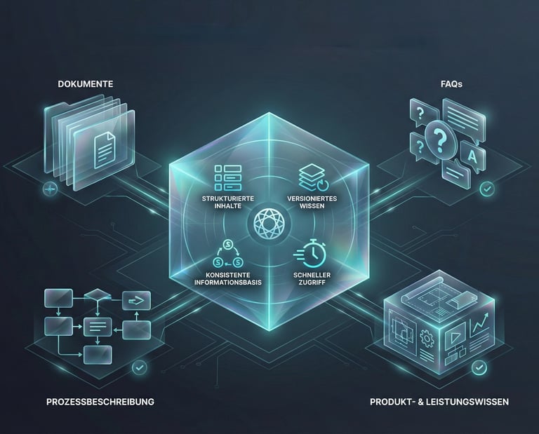 Dokumente, FAQs, Prozessbeschreibungen sowie Produkt und Leistungswissen werden zentral aufbereitet.
