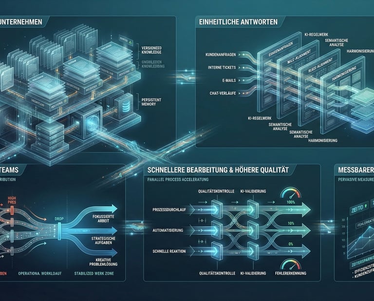 Wissen, Antworten und Abläufe werden zentral verfügbar gemacht, sodass Informationen nicht mehr an einzelne Personen gebunden sind und Teams jederzeit auf verlässliche, geprüfte Inhalte zugreifen können.