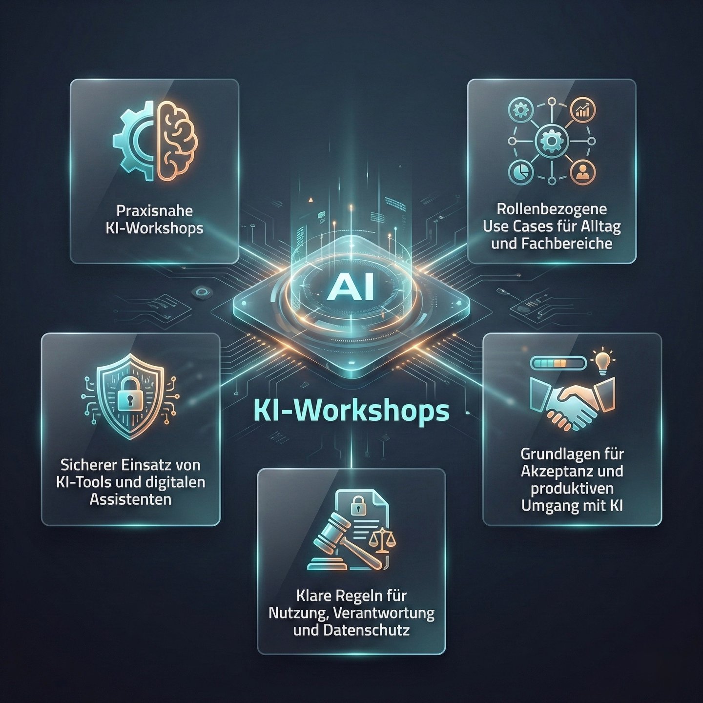 In unseren Workshops vermitteln wir ein solides Grundverständnis für KI und zeigen konkret, wie sie im Arbeitsalltag eingesetzt werden kann.