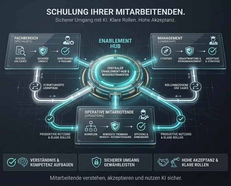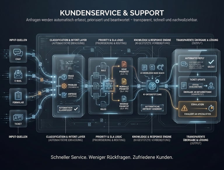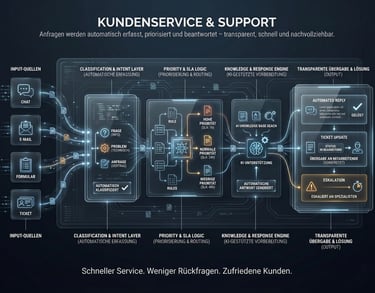 KI wird dort eingesetzt, wo Inhalte, Entscheidungen oder Informationen vorbereitet werden können. Nicht alles braucht KI. Oft ist eine saubere Automatisierung der größte Hebel.