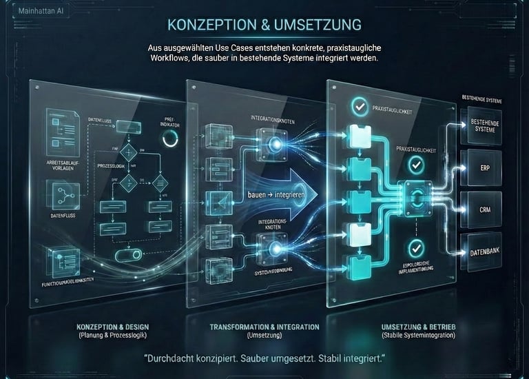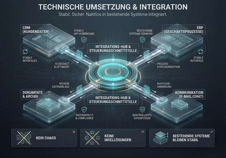 Workflows werden stabil umgesetzt und sauber in bestehende Systeme integriert unter Berücksichtigung von Datenschutz und Akzeptanz.
