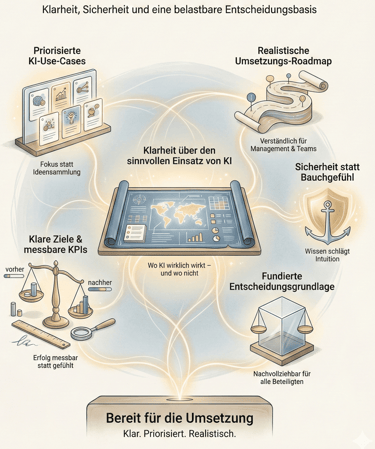Sie erhalten eine klare Entscheidungsgrundlage für den Einsatz von KI in Ihrem Unternehmen. Relevante Anwendungsfälle sind priorisiert, Ziele definiert und die Umsetzung realistisch strukturiert.