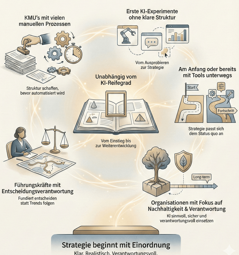 Für Unternehmen mit manuellen Prozessen, für Organisationen mit ersten KI Ansätzen ohne klare Struktur und für Entscheider, die eine fundierte Grundlage für den sinnvollen Einsatz von KI benötigen.