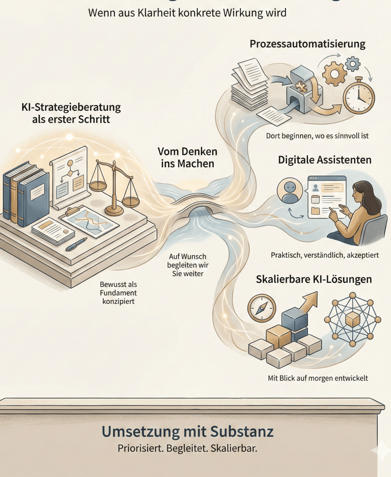 Die KI Strategieberatung ist bewusst als erster Schritt angelegt. Auf Wunsch begleiten wir Sie anschließend bei der strukturierten Umsetzung der identifizierten Maßnahmen.
